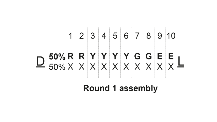 The InDel library shown above is skewed towards shorter sequences than the program as it would be expected from the incomplete incorporations per cycle. In addition, it is heavily skewed towards the immediate sequence neighbourhood of the target sequence (but without some of the biases that would emerge in error-prone PCR). Longer lengths start to increasingly resemble the assembly program (RRYYYYGGEE). In this simulation, the intended target (RYYGE) is present at 0.01% . That would mean that in a usual 1e8 library, the target sequence would be expected to be present approximately 10,000 times.