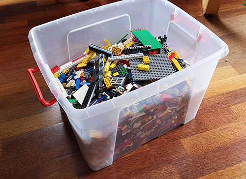 For proteins, in situtations where all amino acids can be considered as possible substitutions, a degeneracy NNK is used, resulting in 32 possibilities to cover the 20 amino acids and 1 STOP codon. This would be equivalent to ordering every 2-peg-wide piece available – different colours, different lengths, different thicknesses. Targetting multiple positions with NNK rapidly increases the size of the library, with a library of 8 NNK containing 1.1e12 DNA variants (32^8). Still, because of the redundancy of the genetic code, the 1.1e12 DNA variants sample only 3.8e10 protein variants (21^8) – i.e. nearly 96% of the library is redundant. Worse still, only about 68% of those 3.8e10 proteins will not include a STOP codon (which in NNK is encoded as UAG). This would therefore be the equivalent of ordering every piece in the shop (as a single order) and you get 6 blue pieces for each yellow one. You can now build any toy, but you have to sort through a huge box.